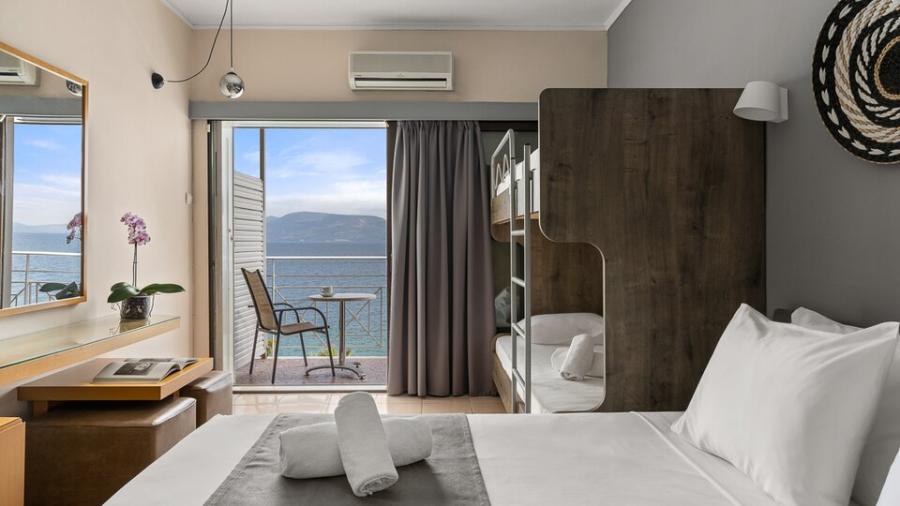 Porodične (family) sobe sa krevetom na sprat, pogled more - Smeštajne jedinice površine oko 23 m², sa francuskim ležajem ili dva osnovna ležaja i krevetom na sprat. Imaju pogled na more. Maksimalni broj osoba u sobi je do četiri ( dve odrasle i dva deteta )