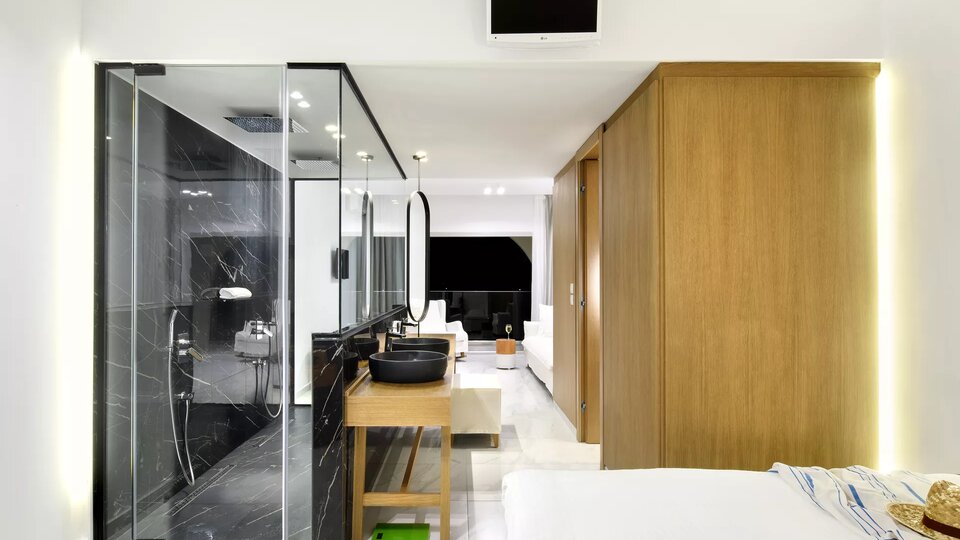 Loft suite panoramski pogled more - Prostrane i luksuzne smeštajne jedinice. Površine su oko 40m2. Poseduju francuski ležaj i dodatni krevet ( najčešće sofa). Imaju prelep panoramski pogled na more. Maksimalni broj osoba u sobi je do tri.