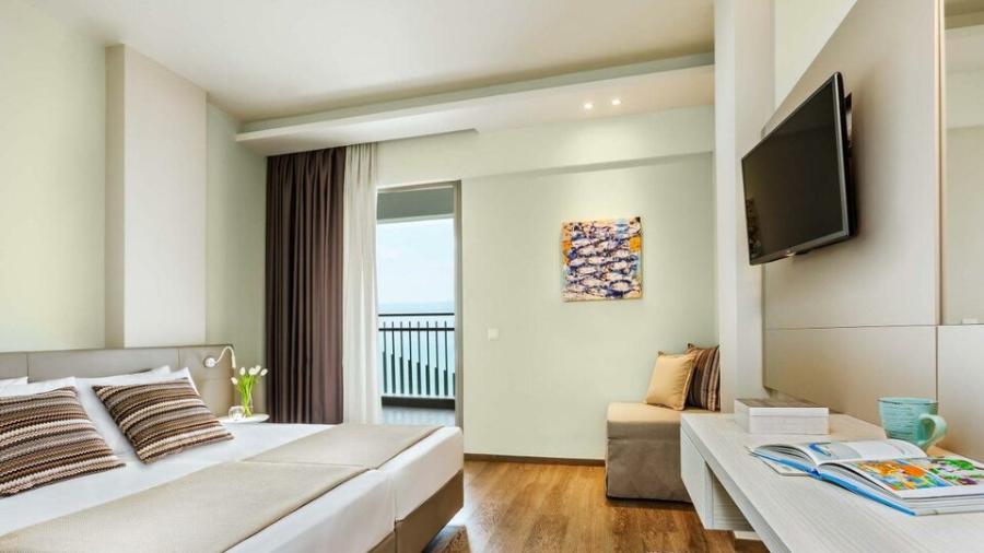 Deluxe soba sa pogledom na more - Veličine oko 21m2, strukture francuski ležaj ili dva osnovna ležaja i sofa na razvlačenje predviđena za smeštaj jedne odrasle osobe ili jednog deteta uzrasta do 11.99 god. Maksimalni broj osoba u sobi je do tri.