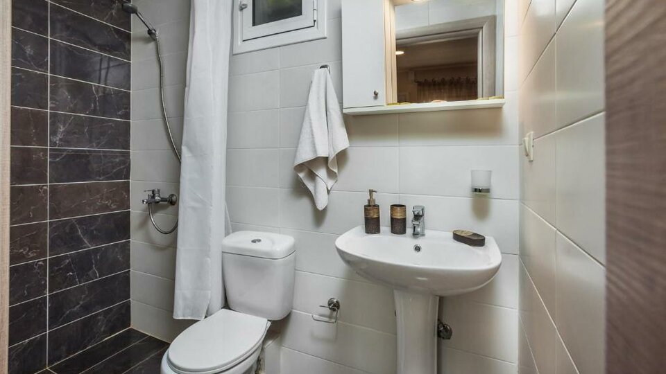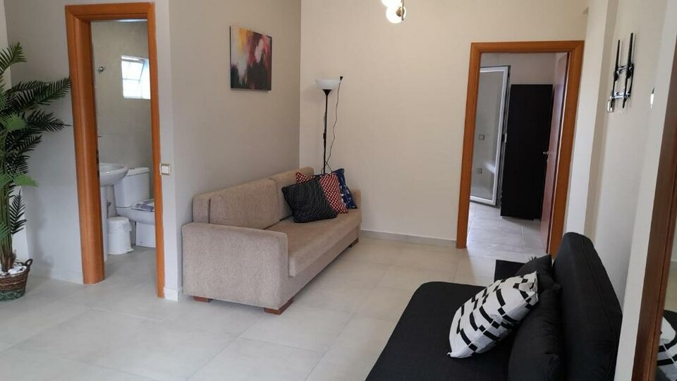 Apartman u spuštenom prizemlju - smeštajne jedinice veličine oko 50m2 nalaze se u spuštenom prizemlju . Poseduju jednu ili dve odvojene spavaće sobe sa francuskim ležajem i prostran dnevni boravak sa sofom u kome se nalazi i mini kuhinja. Maksimalni broj osoba u sobi su šest.