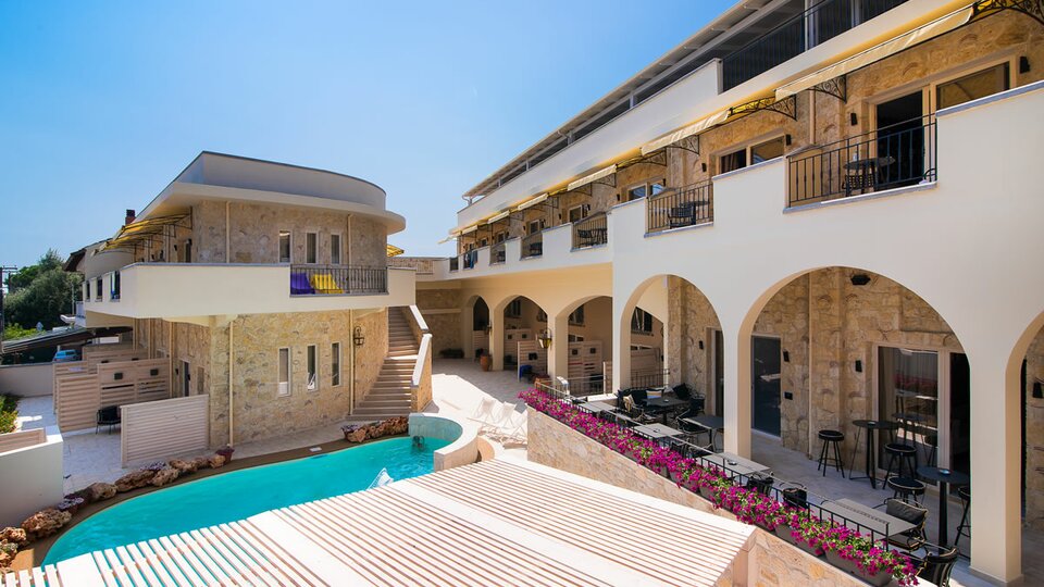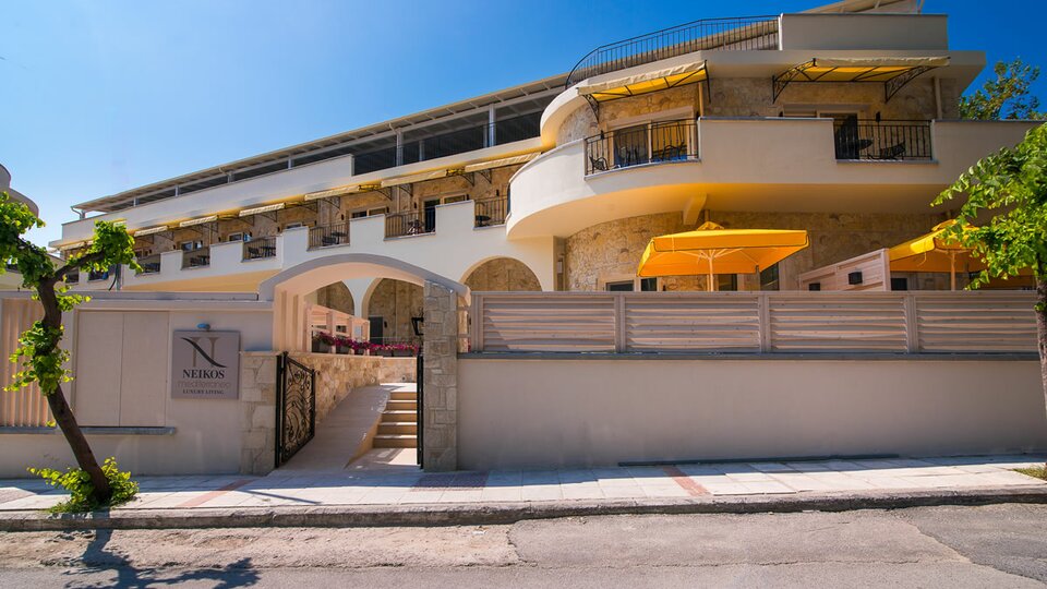 Opis i lokacija: Neikos Mediterraneo Luxury Suites nije klasičan hotel. Kategorisan je sa 4 grčka ključa koji se dodeljuju luksuznim apartmanima. U principu radi se o butik hotelu apartmanskog tipa koji je izgrađen 2018.godine uz poštovanje tradicionalne arhitekture i spada u red novijih hotela u mestu Hanioti . Ovo novo letovalište sa enterijerom inspirisanim prirodom i sa bojama i dodirima mediteranske estetike nalazi se oko 800 m od centra Haniotija a u blizini plaže.