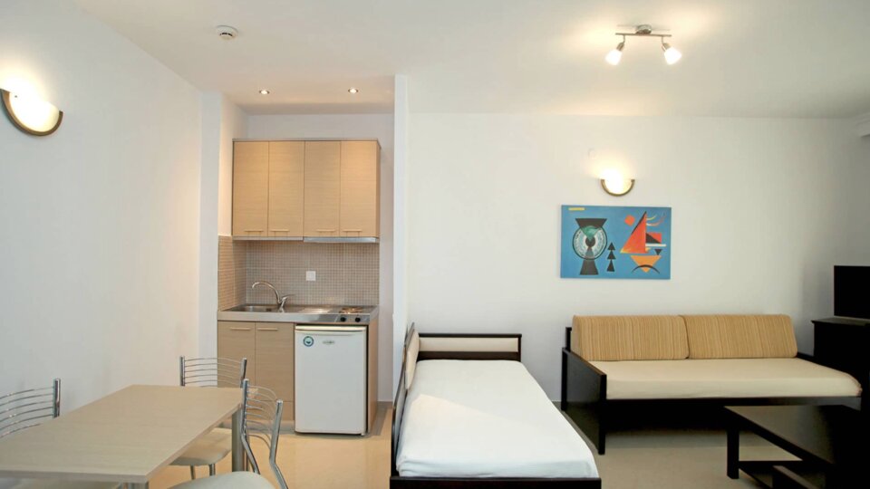 Studio city/inland - sobe površine 25-30 m², strukture francuski ležaj manjih dimenzija i sofa (predviđene za smeštaj jedne odrasle osobe ili dva deteta uzrasta do 11.99 god.) . Ovaj tip smeštajnih jedinica je pozicioniran i u starijoj i u novijoj zgradi hotelskog kompleksa.