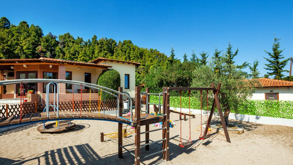 Hotelski sadržaji: Recepcija, parking , restoran, bar pored bazena, dečje igralište, animacija za decu, mini klub za decu, otvoreni bazen, tereni za tenis i košarku, stoni tenis, usluga iznajmljivanja peškira za plažu, večernja animacija.