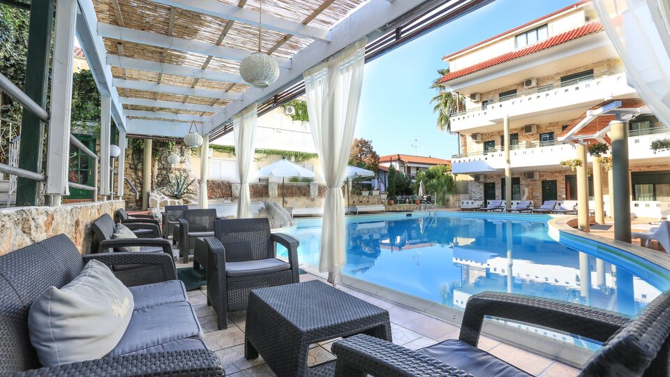 Opis i lokacija: Skrivena u mirnom delu letovališta Pefkohori ova prijatna oaza sastoji se od dve međusobno povezane zgrade smeštene oko zajedničkog dvorišta sa relaksirajućim otvorenim bazenom. Sa sobama raspoređenim na tri sprata, uključujući dvokrevetne, trokrevetne sobe i porodične apartmane, udobnost je zagarantovana. Dodatni sadržaji uključuju saunu, hidromasažnu kadu i masaže uz doplatu, kao i prostor za igru za decu i aktivnosti pod nadzorom. Za opuštanje pored bazena obezbeđene su besplatne ležaljke i suncobrani. Privatni parking je dostupan u okolini uz prethodnu rezervaciju i doplatu.