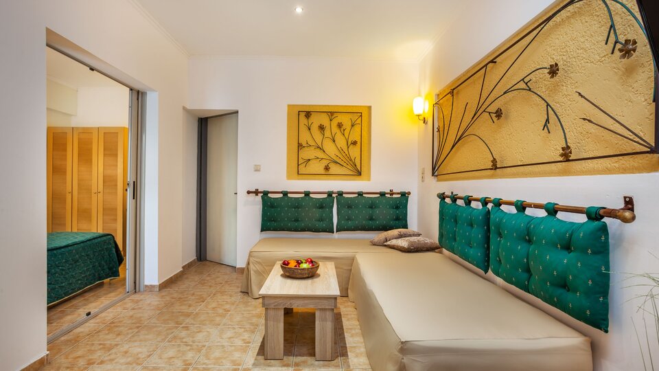 Porodična soba (bez pogleda) - Nalaze se u prizemlju i gledaju obično na prilaz hotelu, bez definisanog pogleda. Veličine su oko 40m2. Ima spavaću sobu sa francuskim krevetom ( ili dva odvojena kreveta) koja je kliznim vratima odvojena od dnevnog boravka u kome se nalaze 2 sofe. Maksimalni broj osoba u sobi su četiri. Kapacitet sobe: Max 4 osobe ( Odrasli: Max 3 , Deca: Max 2, Beba: Max 1 )