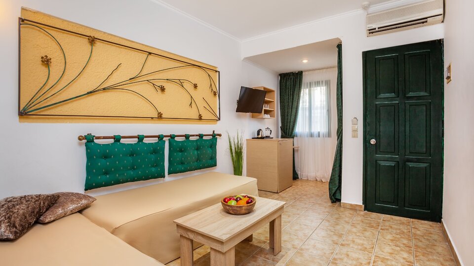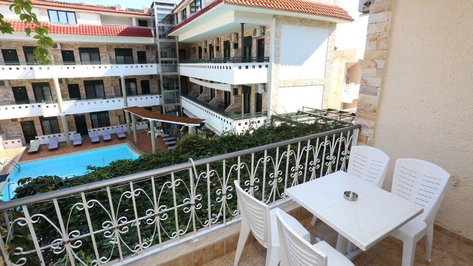 Standard soba pored bazena - Smeštajne jedinice površine 20-22m2. Nalaze se u zgradi pored bazena. Sadrže francuski ili dva odvojena kreveta i sofu za treću odraslu osobu. Dete do 2,99 godina može da deli ležaj sa roditeljima.