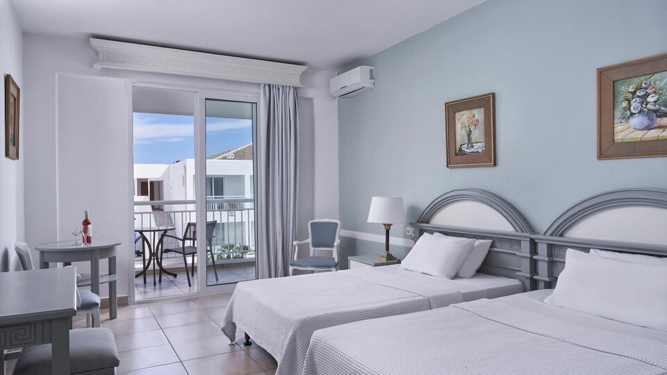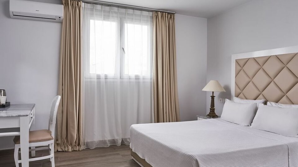 Klasik soba pogled dvorište/bočni pogled more - smeštajne jediice površine oko 25m². Sadrže francuski ležaj ili dva osnovna ležaja i pomoćni ležaj za treću osobu (najčešće sofa). Mogu imati balkon, terasu ili verandu sa pogledom na dvorište ili sa bočnim pogledom na more. Maksimalni broj osoba u sobi su tri.