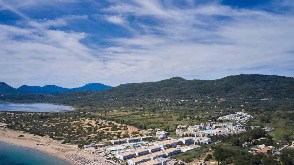 Opis i lokacija: Sandy beach resort smešten je na jugozapadu Krfa, na samoj plaži u predgrađu mesta Agios Georgios, oko 30 km od grada Krfa i 18 km od luke Lefkimi. Sastoji se od soba i apartmana raspoređenih u 22 niske zgrade pa ovaj raspored daje kompleksu prirodni osećaj. Odmaralište zaista ima ponešto za svakoga, uključujući sopstveni vodeni park sa četiri neverovatna tobogana.