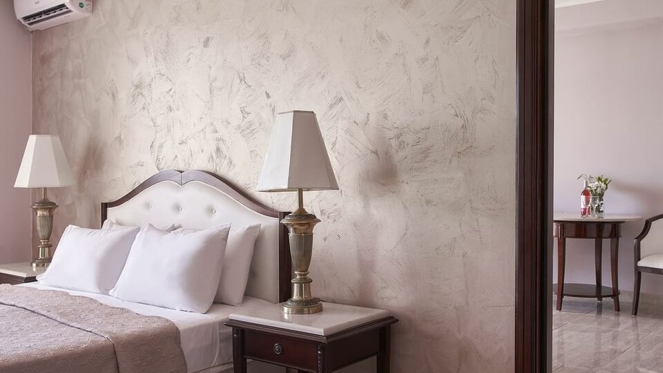 Junior suite pogled dvorište - Prostrane sobe veličine oko 60m². Imaju odvojenu spavaću sobu od dnevne. U spavaćoj sobi su francuski ili dva odvojena kreveta a u dnevnom boravku najčešće dve sofe. Mogu imati balkon, terasu ili verandu. Maksimalni broj osoba u sobi su četiri .