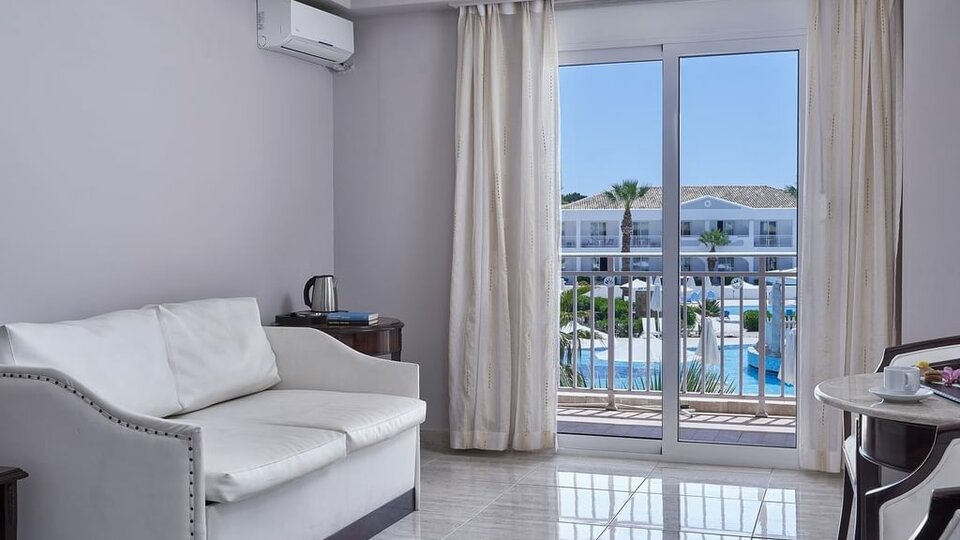 Junior suite bočni pogled more - Prostrane sobe veličine oko 60m². Imaju odvojenu spavaću sobu od dnevne. U spavaćoj sobi su francuski ili dva odvojena kreveta a u dnevnom boravku najčešće dve sofe. Mogu imati balkon, terasu ili verandu. Maksimalni broj osoba u sobi su četiri .