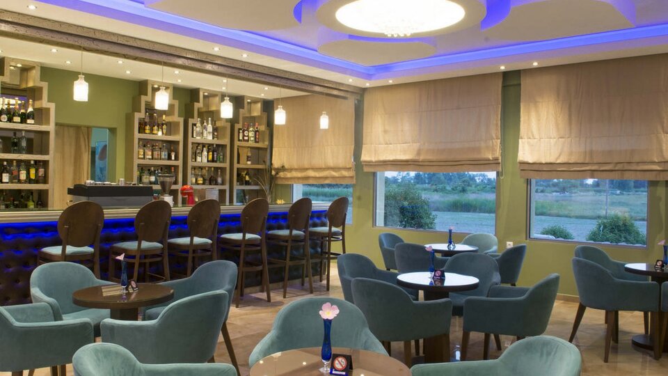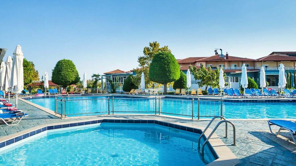 Hotelski sadržaji: Recepcija, restoran, taverna, bar na plaži, bar pored bazena, dečije igralište, bazen sa odeljkom za decu, odbojka na pesku, konferencijska sala.
