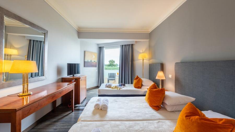 Dvokrevetna soba bočni pogled more (glavna zgrada) – Nalazi se u glavnoj zgradi, ima bračni ili dva odvojena kreveta i pomoćni ležaj za 3. osobu. Maksimalni broj osoba u sobi je do tri. Kapacitet sobe: Max 3 osobe ( Odrasli: Max 3 , Deca: Max 1, Beba: Max 1)