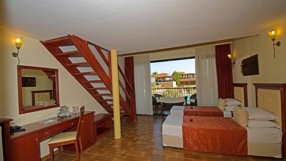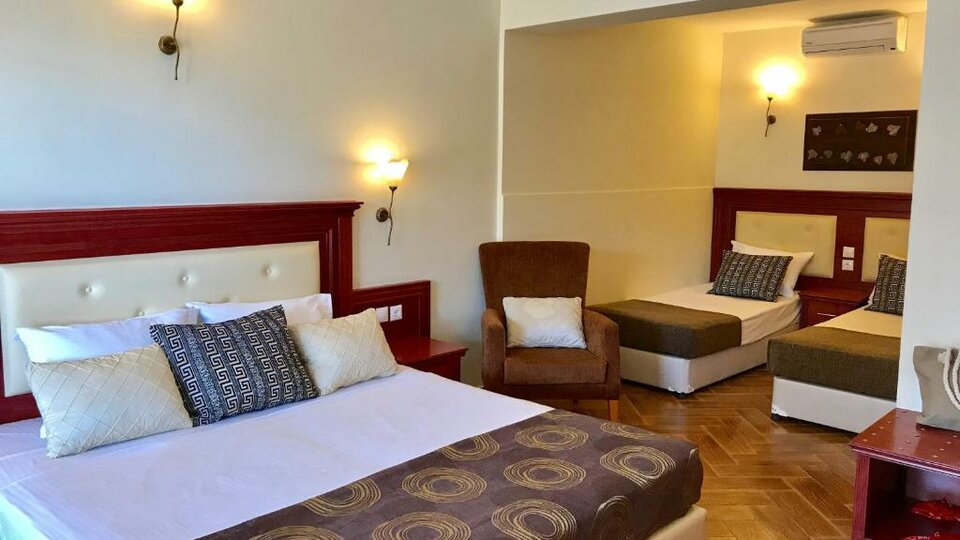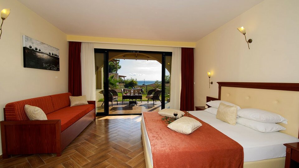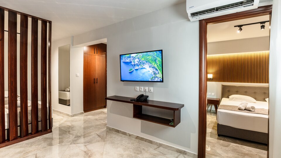 Superior deluxe soba – soba otvorenog plana, moderno nameštena, površine oko 31m2, nalazi se u prizemlju sa pogledom na bazen ili dvorište, namenjena je za do 5 osoba sa francuskim ili dva odvojena ležaja i dodatnom sofom i kamp ležajem. Kapacitet sobe: Max 5 osobe ( Odrasli: Max 4 , Deca: Max 3 ) Minimum za naplatu su 3 odrasle ili 2 odrasle + 2 dece