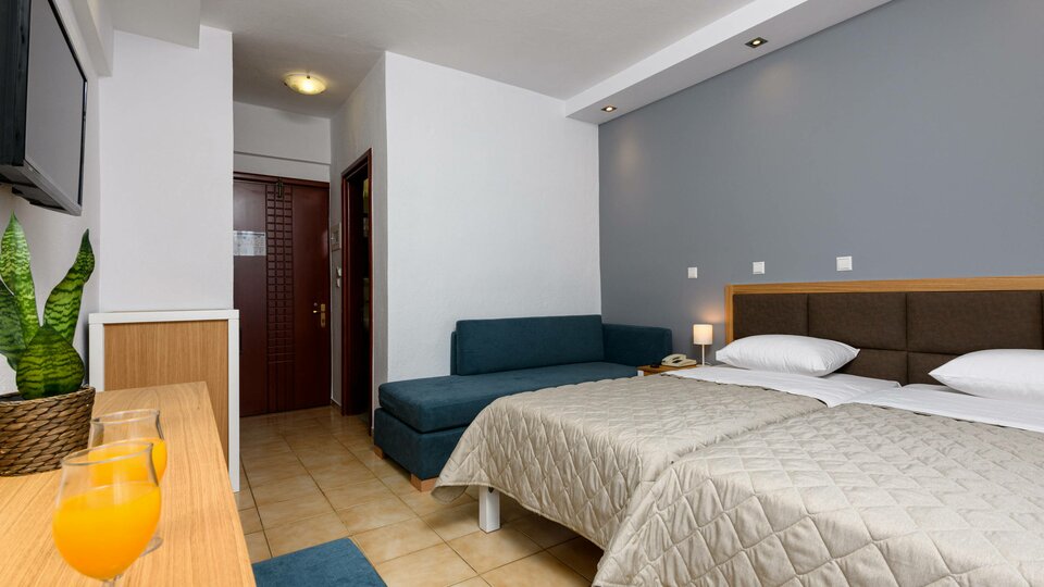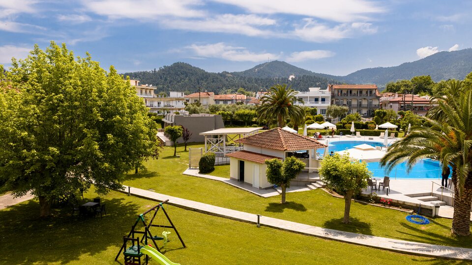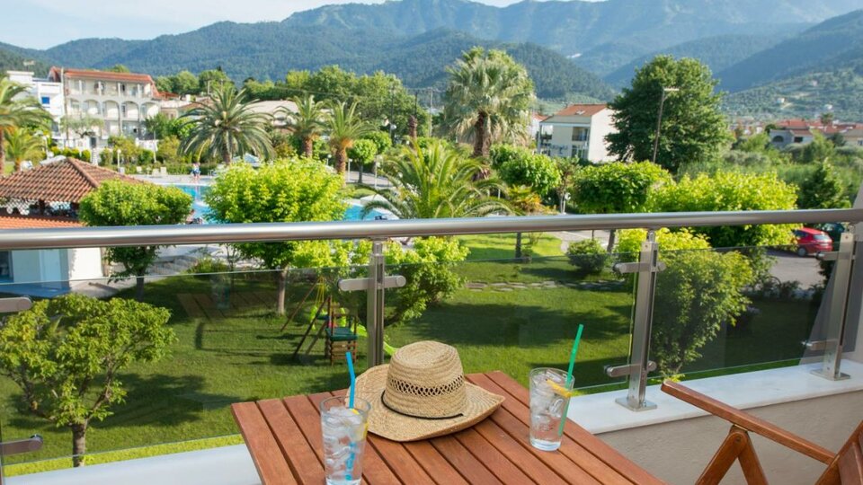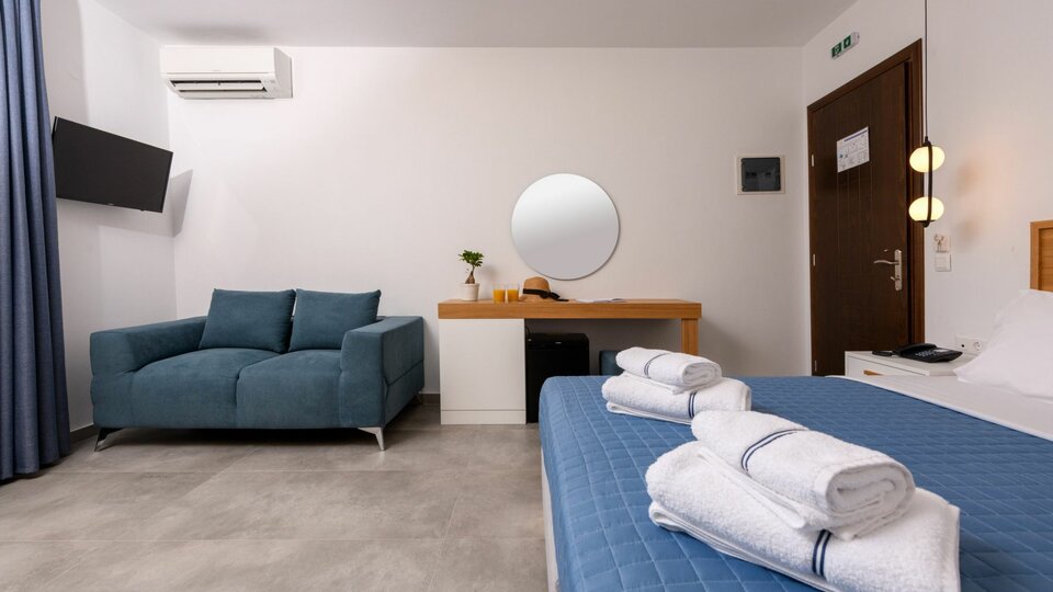 Opis i lokacija: Smešten u prelepom ambijentu, okružen palmama i baštom, nalazi se na oko 400 m od glavne luke i oko 600m od arheološkog muzeja i centra Limenasa.