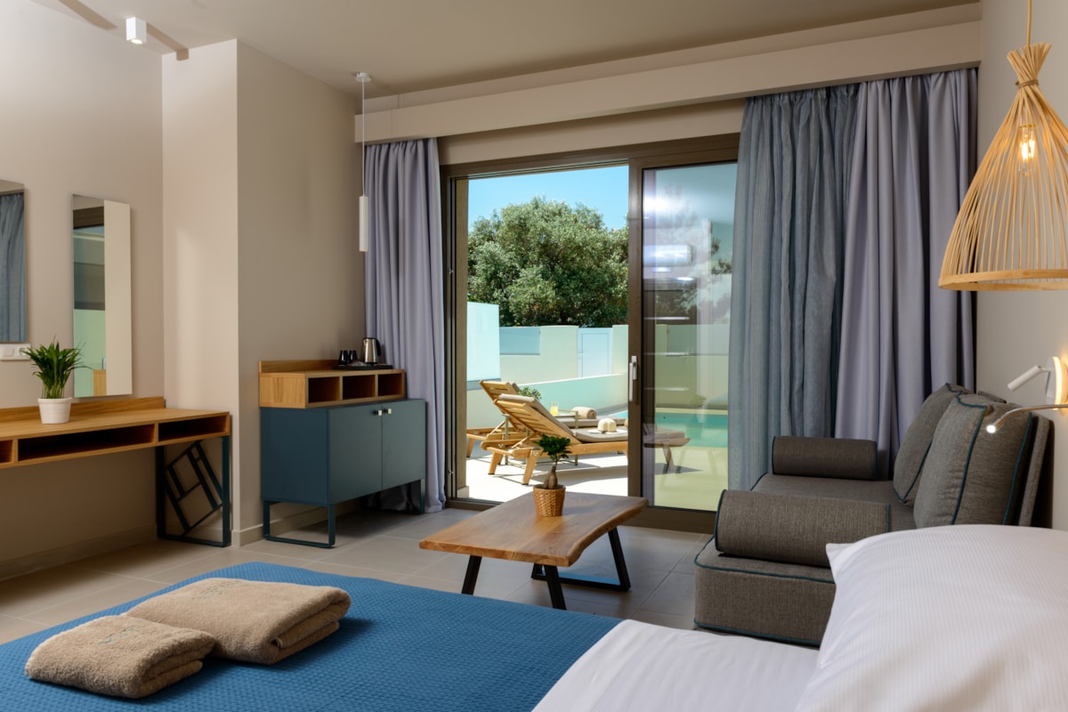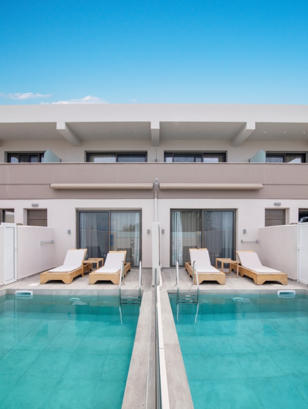 Junior suite sa privatnim bazenom - smeštajne jedinice površine oko 28 m², jedinstvena celina koja se sastoji iz kombinovano dnevno-spavaćeg dela sa francuskim ležajem ili dva osnovna ležaja i pomoćnim krevetom (sofom na rasklapanje ili žičanim krevetom na rasklapanje). Pomoćni krevet je namenjen za smeštaj jedne odrasle osobe ili dva deteta uzrasta do 11.99 god. Maksimalni broj osoba u sobi je do četiri. Na terasi se nalazi privatni bazen.