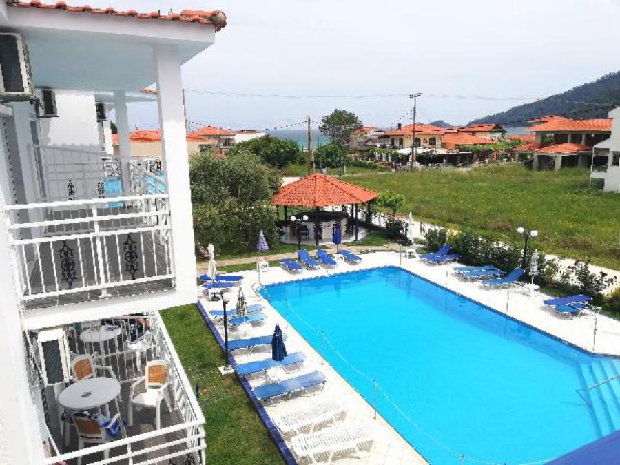 Opis i lokacija: Jednospratni kompleks sa visokim prizemljem koji čine dve zgrade. Nalazi se u mirnom delu i širem centru Skala Potamije, ispod glavne magistrale. U sklopu kompleksa nalazi se bazen i bar.