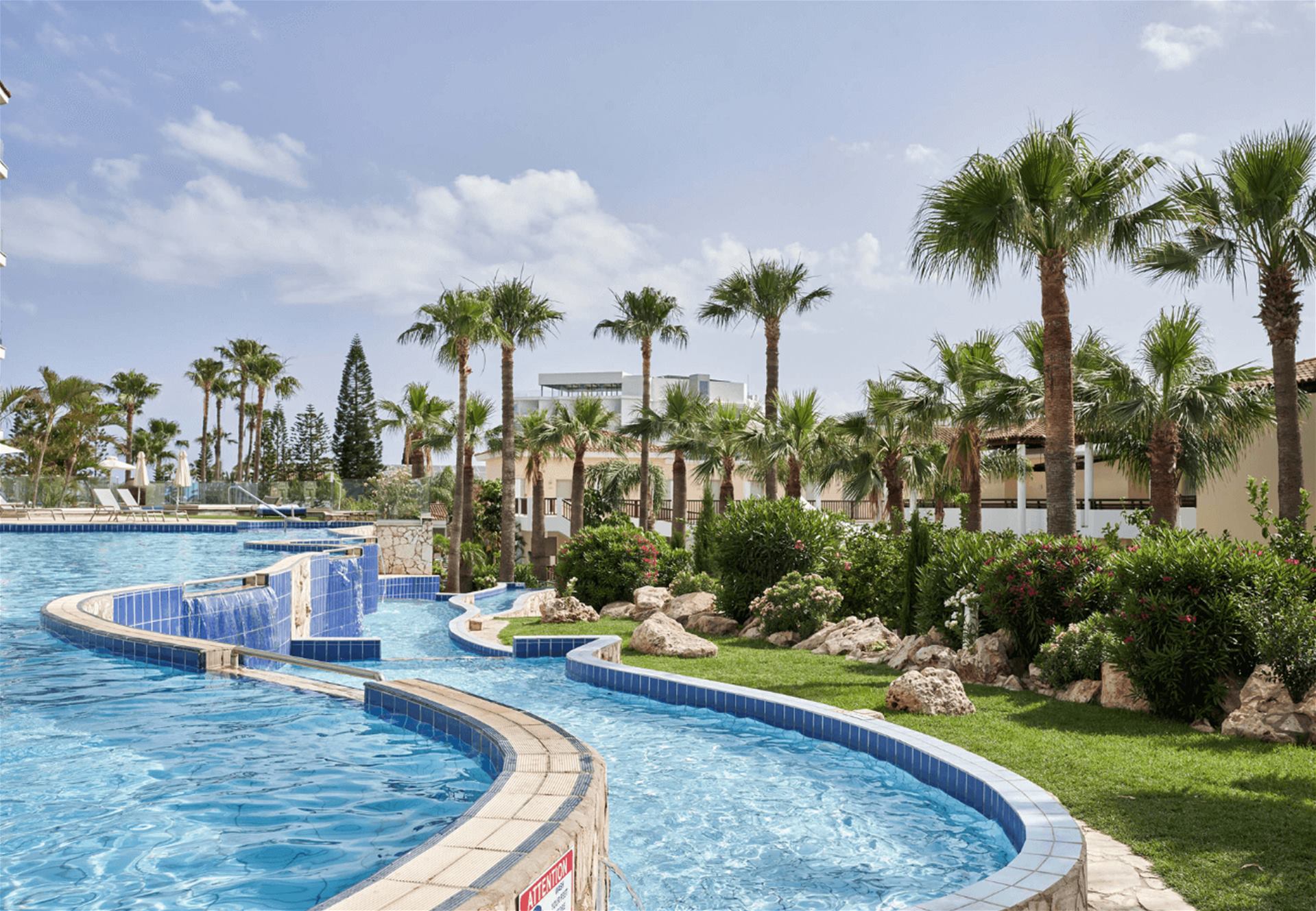 Atlantica Aeneas Hotel 5* je luksuzan hotel koji se nalazi na odličnoj, mirnoj, lokaciji na oko 200m od čuvene Nissi plaže od koje ga deli ulica. Udaljen je od centra Aja Nape oko 3,2km. Hotelski kompleks je izgrađen oko jednog od najvećih free form bazeni na Kipru.