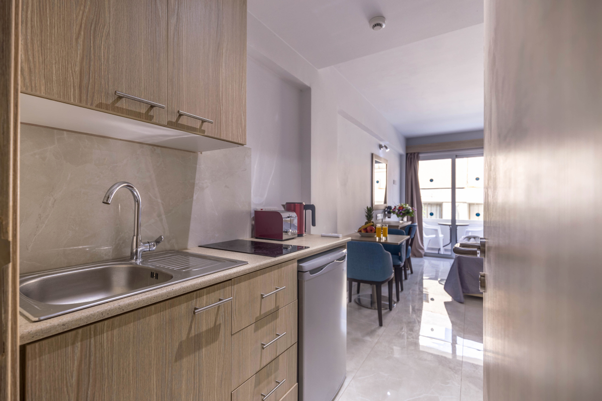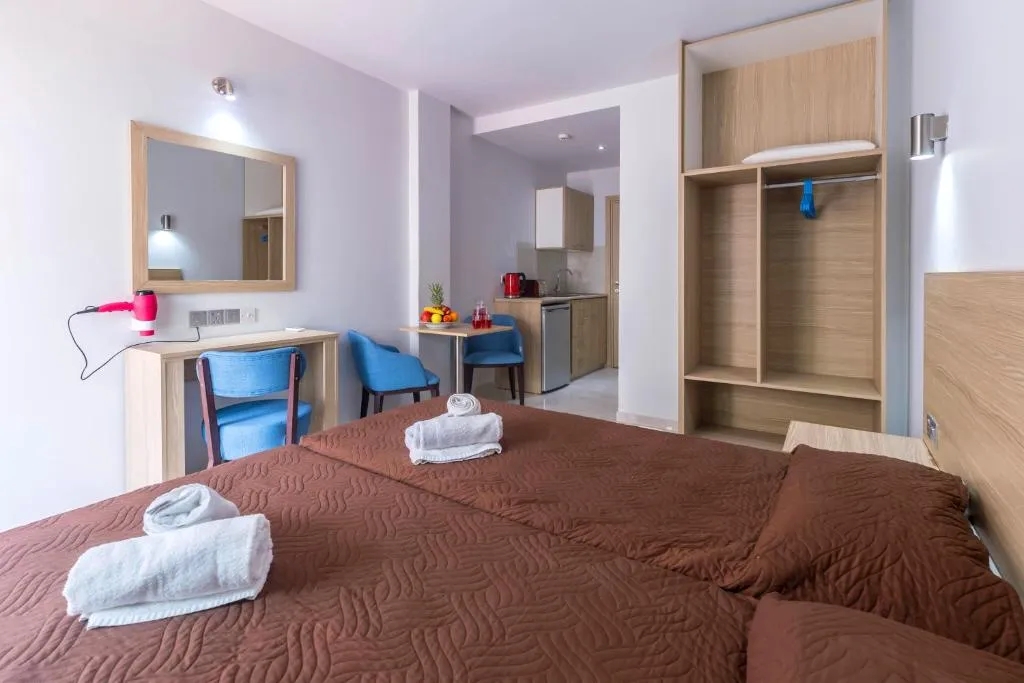 Studio Apartmani su tipa dvokrevetnog studija, sa twin krevetima. Opremljeni su mini čajnom kuhinjom za pripremu lakih obroka. klima uređajem, TV-om, WiFi-jem, sefom, kupatilom sa TWC-om i fenom, balkonom. Mogu smestiti maximum 2 osobe.