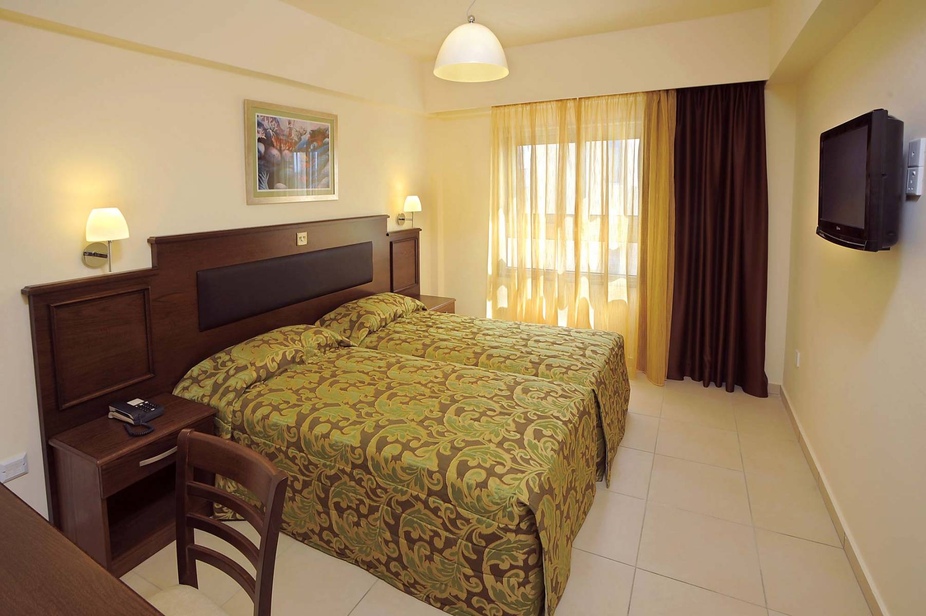 Smeštaj: Hotel poseduje studije za smeštaj 2-3 osobe i apartmane za smeštaj maksimum 4 osobe. Sve sobe su opremljene klima uređajem, TWC-om, fenom, telefonom, SAT TV-om, WiFi-jem, sefom, delom za sedenje, mini frižiderom i čajnom kuhinjom, balkonom ili terasom. Sve sobe su renovirane.