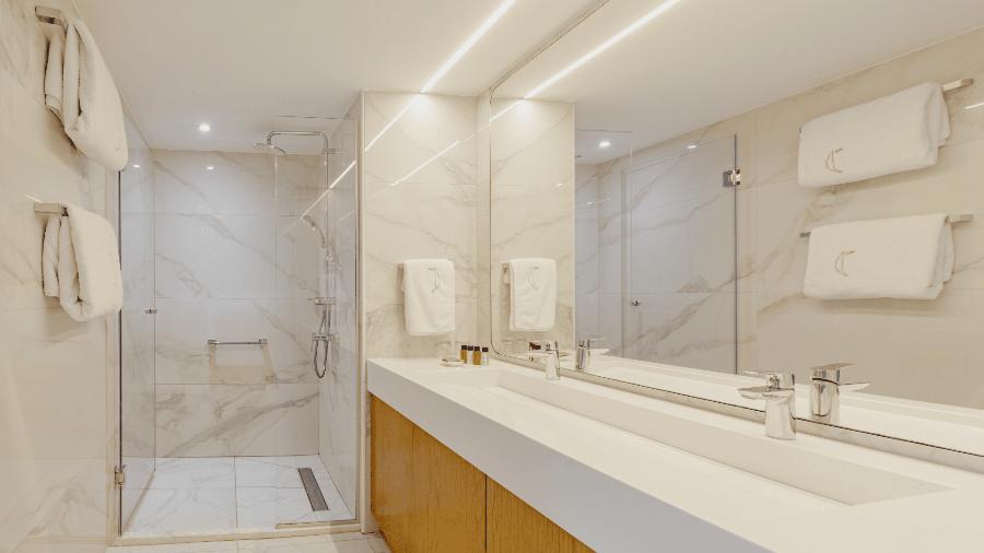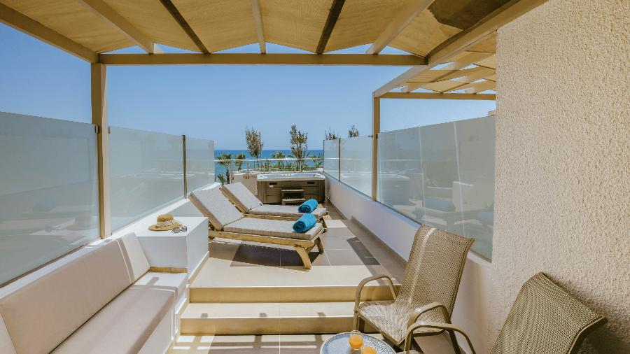 Mini Suite SSV su površine oko 32m2, dvokrevetne sa francuskim ležajem i sofom na rasklapanje za smeštaj odrasle osobe ili deteta do 12 godina. Imaju bočni pogled na more (Side Sea View) i privatan đakuzi na terasi. Mogu smestiti maximum 3 osobe.