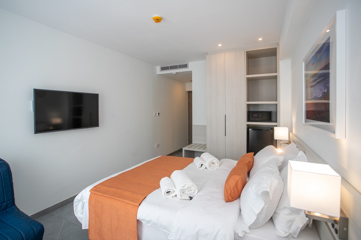 Smeštaj: Hotel poseduje 90 soba i različite tipove smeštajnih jedinica. Sve sobe su moderno opremljene sa klima uređajem, SAT TV-om, WiFi-jem, sefom, telefonom, setom za kafu/čaj i mini barom (uz doplatu), kupatilom sa fenom, balkonom. Sobe mogu imati pogled na grad ili bazen.