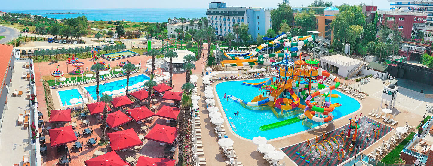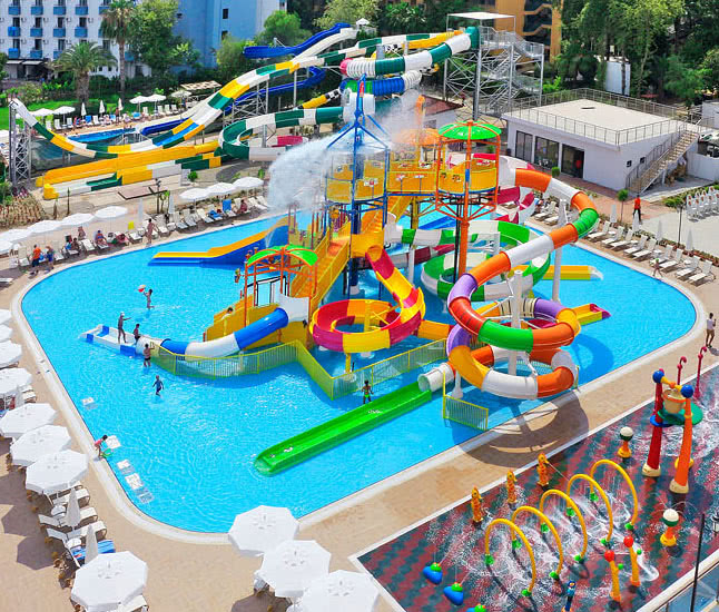 Sadržaj: recepcija, restoran, 9 barova, bazen za odrasle i decu, vodeni tobogan, 3 spoljašnja bazena, 6 vodenih tobogana, tursko kupatilo, akvabik, slana soba, teretana, sauna, aerobik, stoni tenis, odbojka na pesku, pikado, animacija, dečiji klub (4-7, 8-12 godina), dečiji park, 2 dečija bazena i akva-park. Plaća se: doktor, masaža, mini-golf, bilijar, igre na automatima, sportovi na vodi, usluga pranja veša. dnevne i večernje animacije po utvrđenom hotelskom rasporedu.