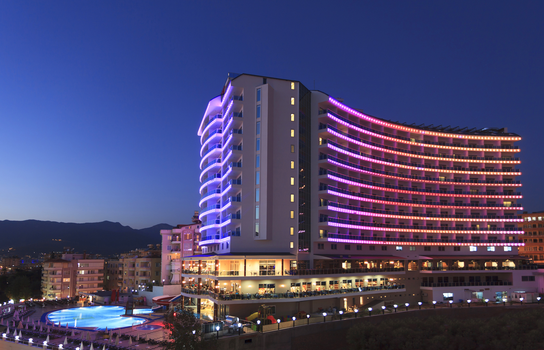 Sadržaj: recepcija, nekoliko restorana i barova,bazen za odrasle i decu,vodeni tobogan za decu, mini klub za decu, sauna , tursko kupatilo , animacioni tim, aquabik, stoni tenis, pikado,bilijar,večernji programi,odbojka na plaži.