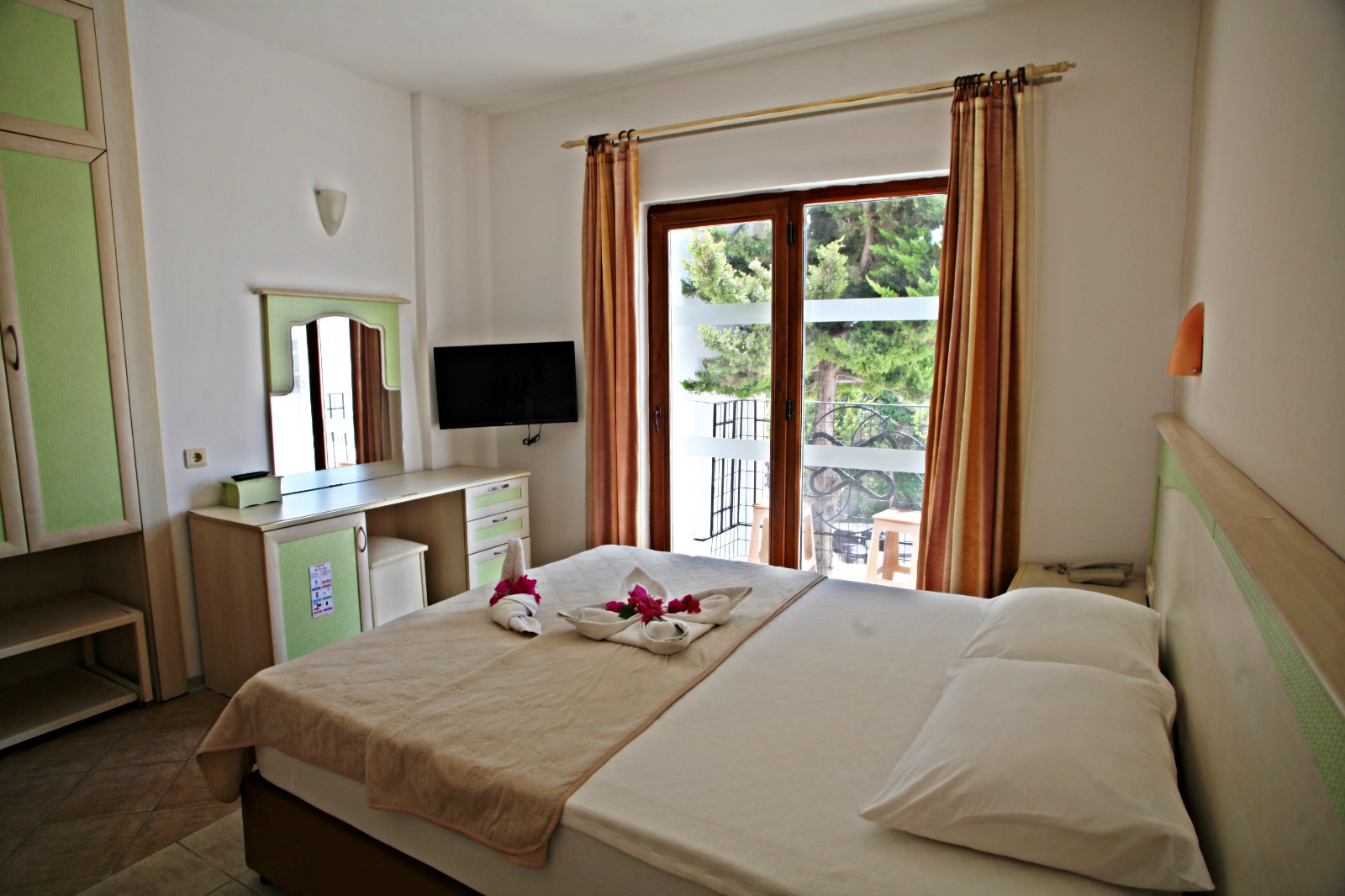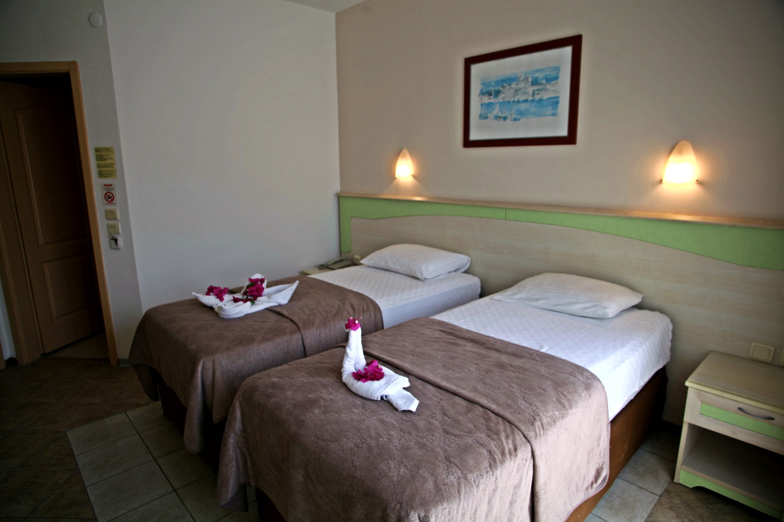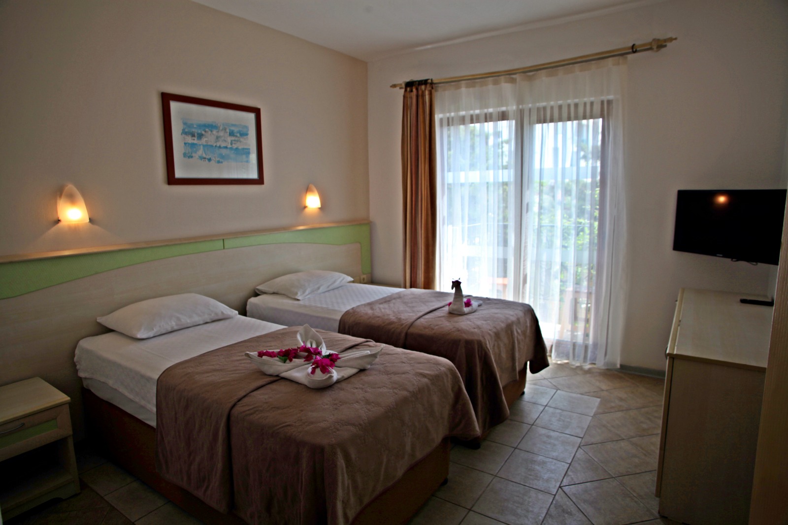 Smeštaj: Standardne sobe - dvokrevetne ili dvokrevetne sa pomoćnim ležajem, opremljene TWC-om, fen-om, TV-om, klima uređajemem (dodatno se plaća u agenciji, uz prethodnu najavu, 5€ po sobi dnevno), mini barom (dodatno se plaća), telefonom, sefom (dodatno se plaća). Promo sobe se od standardnih soba razlikuju po kvalitetu smeštaja, poziciji u samom hotelu i ograničenog su broja.Kapacitet sobe:max 3 odrasle osobe