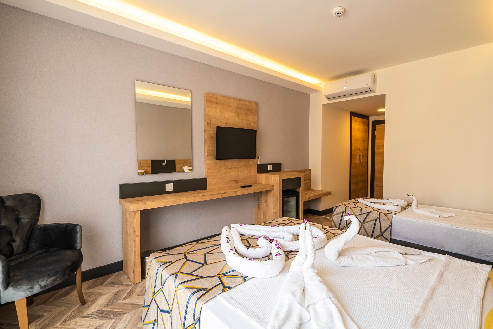 Smeštaj: Hotel poseduje 88 soba. Standardne sobe - dvokrevetne ili dvokrevetne sa pomoćnim ležajem, opremljene TWC-om, klima uređajem, fenom, telefonom, TV-om, mini barom (uz doplatu), balkonom.